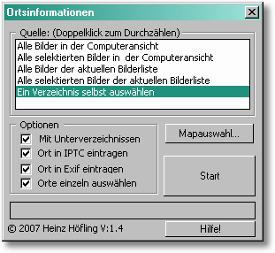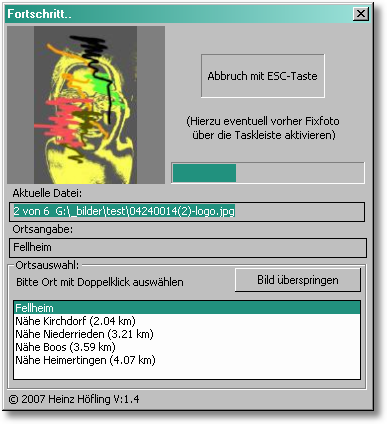 Wer möchte, kann sich für jedes Bild eine vordefinierte Anzahl aller Orte in der Umgebung der GPS-Koordinaten für jedes Bild in einer Liste anzeigen lassen. Der gewünschte Ort wird dann einfach per Doppelklick ausgewählt und verarbeitet.